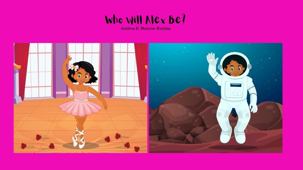 Who will Alex be? is my third book. This book was a lot of fun! This book is all about girl-power and representation. It tells the story of a young girl who is daydreaming about the possibilities of career choices when she grows up. From ballerina to Astronaut, she uses words of affirmation to declare that she will be anything she chooses to be! This is very important for girls of color to know that they are not limited and that the choice is theirs. Representation impacts self esteem and so planting seeds such as these, is a must.