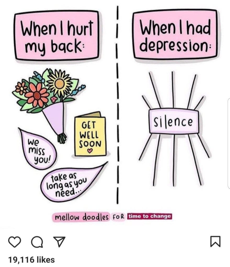 I was scrolling through Instagram today and I came across a post that made me pause and reflect. It was a simple post with drawings, featuring a side by side comparison of the response from others, when one has a physical pain vs. mental pain: “When I hurt my back” vs. “When I had depression.” Under the first heading of the back injury, there were flowers, a get well soon card, and sentiments that reflected understanding and empathy.